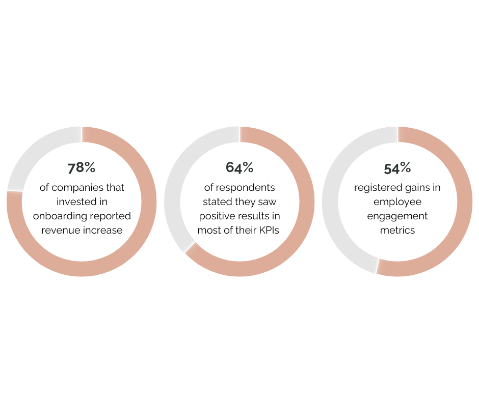 HCI's 2023 onboarding stats show that organizations investing in onboarding processes reap several benefits. In addition to increased revenue, 64% of respondents noticed improvements in their key performance indicators (KPIs). Moreover, 54% reported boosts in employee engagement.